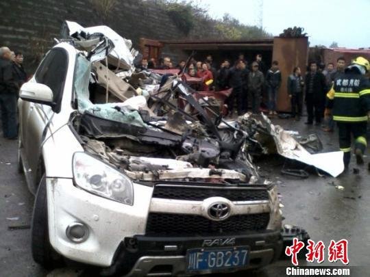 “当时只听见一阵尖厉的金属摩擦声,然后就看见对面翻过来一辆大车。”回忆起事发时的情景,市民刘先生显得惊魂未定,语音中还带着颤抖。事故发生时,刘先生驾驶福特轿车,带着一家老小准备去重庆。白色越野车和红色轿车就在他眼前惨遭灭顶之灾———大货车从天而降,距离他仅不到50米。