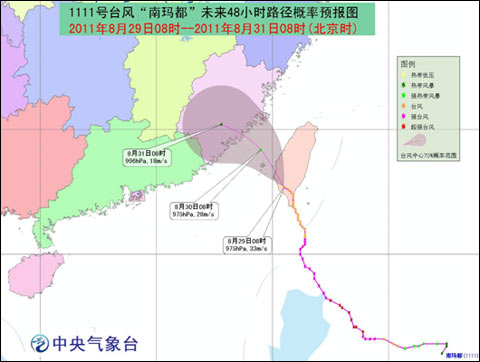 北京8月29日据中 国之声《新闻晚高峰》报道,今天(29日)凌晨4:20,今年第11号台风“南玛都”在台湾登陆。离开台湾后,“南玛都”将步步逼近福建省。受“南玛都” 影响,福建地区今明两天将迎来大风大雨的天气。福建省各地各部门都已做好准备,严阵以待。
