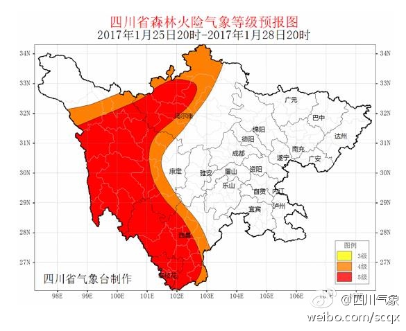 根据最新气象资料分析,预计2017年1月26~28日:甘孜州大部、阿坝州西部、凉山州大部、攀枝花市以晴到多云天气为主,空气干燥,气温偏高,森林火险气象等级可达4~5级。请有关市州加强火源管理,做好森林防火工作。