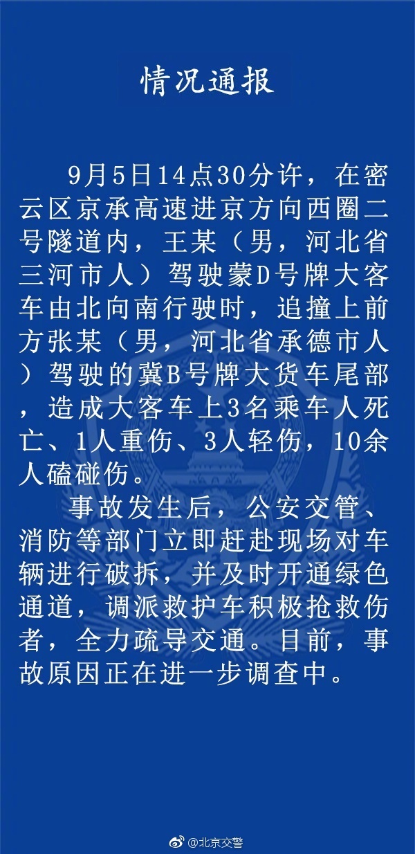 据北京市公安局公安交通管理局官方微博消息,9月5日14点30分许,在北京市密云区京承高速进京方向西圈二号隧道内,一辆大客车撞上大货车,造成大客车上3名乘车人死亡、1人重伤、3人轻伤,10余人磕碰伤。目前,事故原因正在进一步调查中。